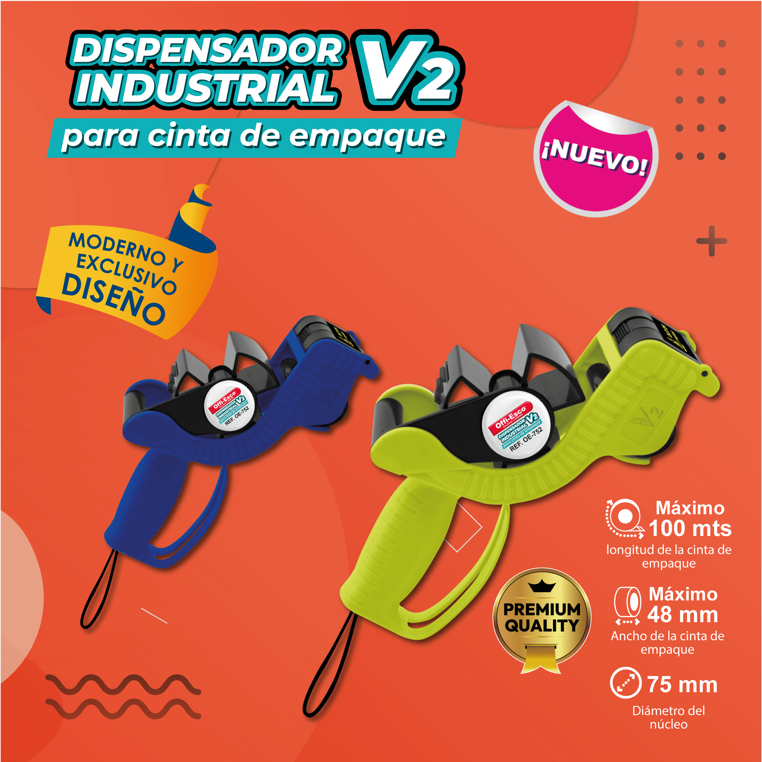 Capacidad Estándar: Compatible con rollos de cinta de hasta 48 mm de ancho, 100 metros de largo y núcleo de 75 mm.